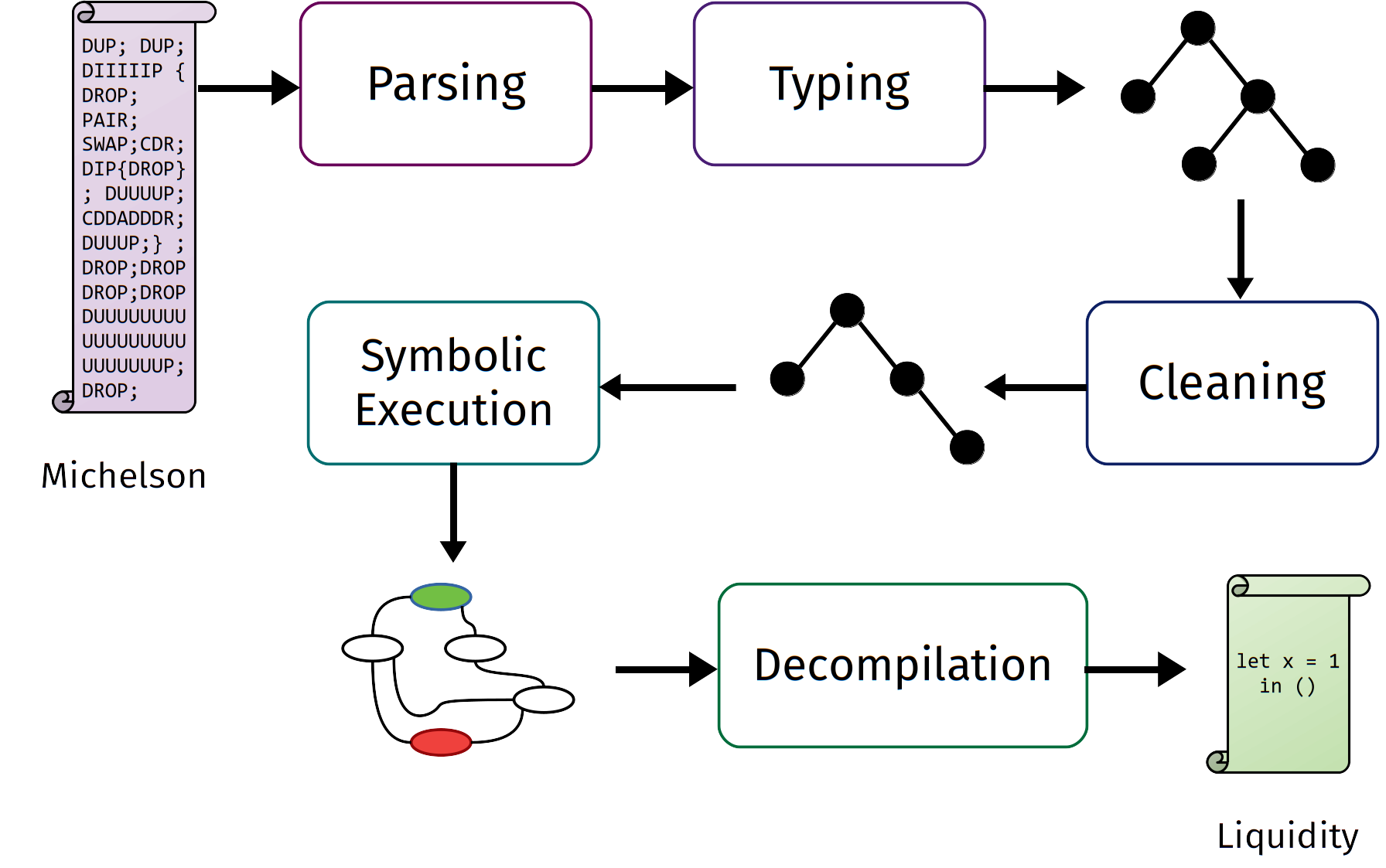 - Decompilation consists in transforming the graph generated by the previous step in a Liquidity syntax tree. Names for variables are recovered from annotations produced by the Liquidity compiler (in case we decompile a Michelson program that was generated from Liquidty), or are chosen on the fly when no annotation is present (e.g. if the Michelson program was written by hand).