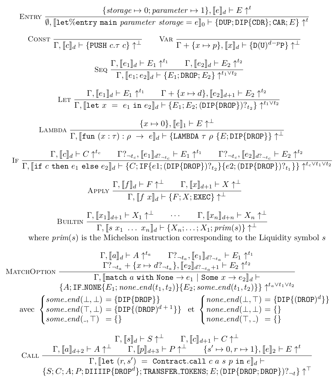 We note by Γ, [|x|]d ⊢ X ↑t compilation of the Liquidity instruction x, in environment Γ. Γ is a map associating variable names to a position in the stack. The compilation algorithm also maintains the size of the current stack (at compilation of instruction x), denoted by d in the previous expression. Below is a non-deterministic version of the compilation schema, the one implemented in the Liquidity compiler being a determinized version.