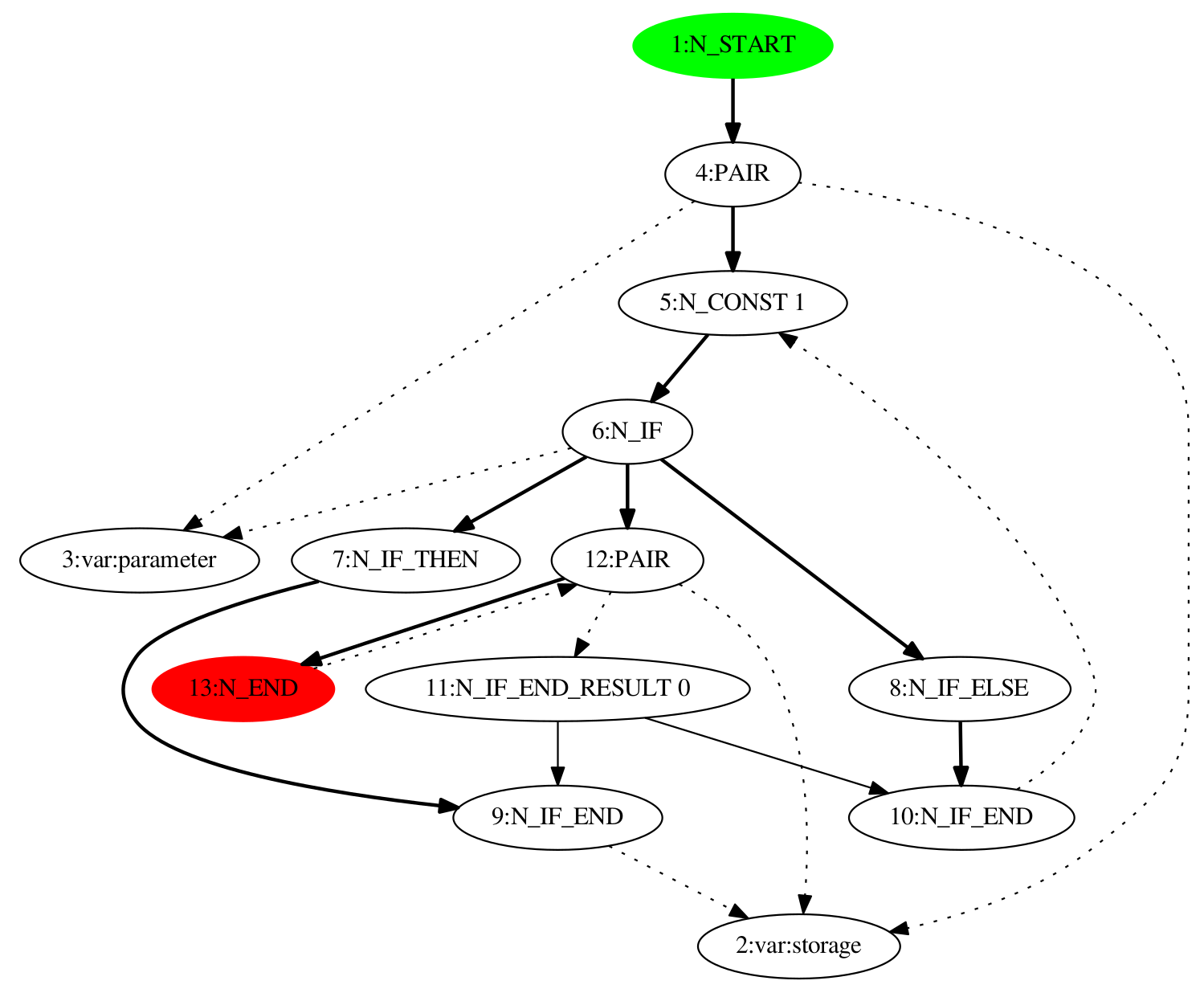 The above translation to Liquidity also contains an if, but it has to return a value. The graph below is the result of the symbolic execution phase on the Michelson program. The IF instruction is decomposed in several nodes, but does not contain any remaining instruction: the result of this if is in fact the difference between the stack resulting from the execution of the then branch and from the else branch. It is denoted by the node N_IF_END_RESULT 0 (if there were multiple of these nodes with different indexes, the result of the if would have been a tuple, corresponding to the multiple changes in the stack).
