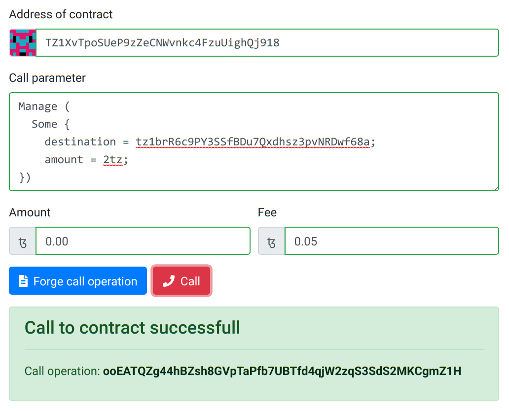 We can also make a call to withdraw money from the contract. This is done by passing a parameter of the form: