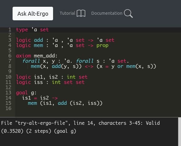 Have you heard about our Try-Alt-Ergo website? Created in 2014 (see our blogpost), the first objective was to facilitate access to our performant SMT Solver Alt-Ergo. Try-Alt-Ergo allows you to write and run your problems in your browser without any server computation.