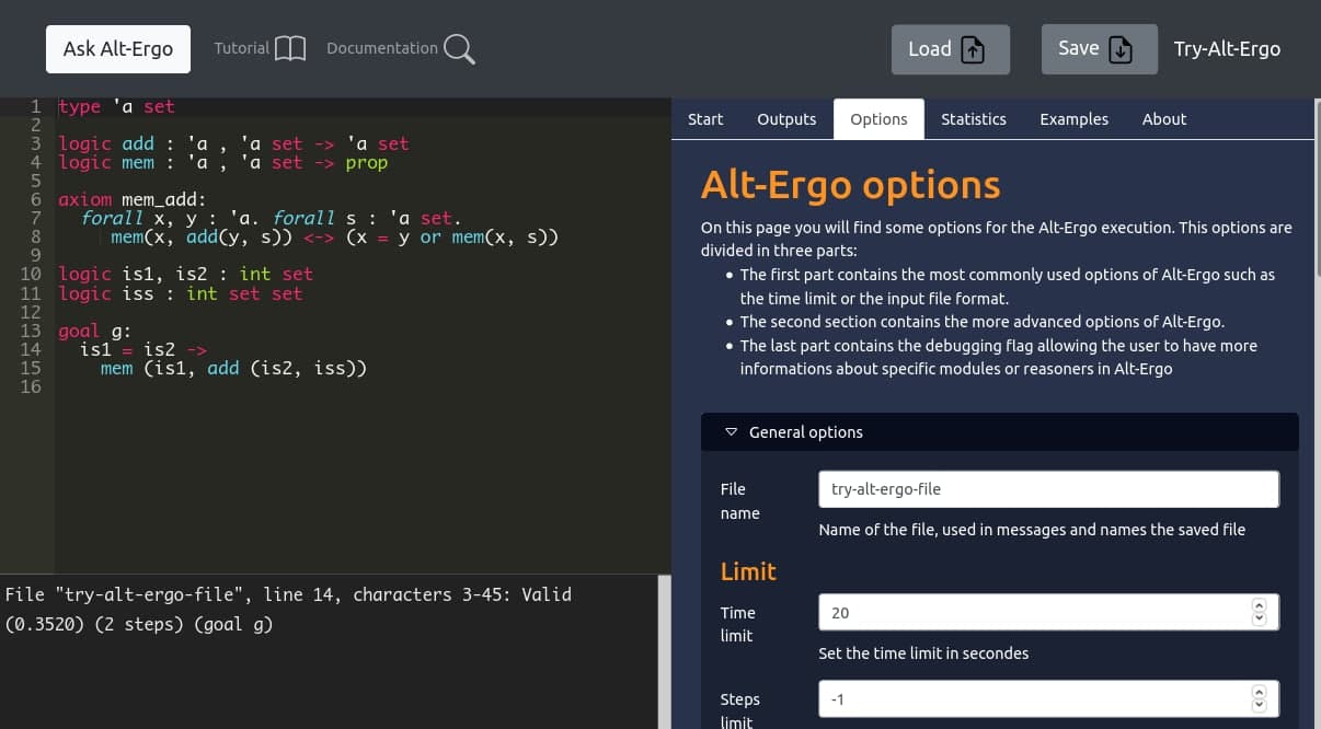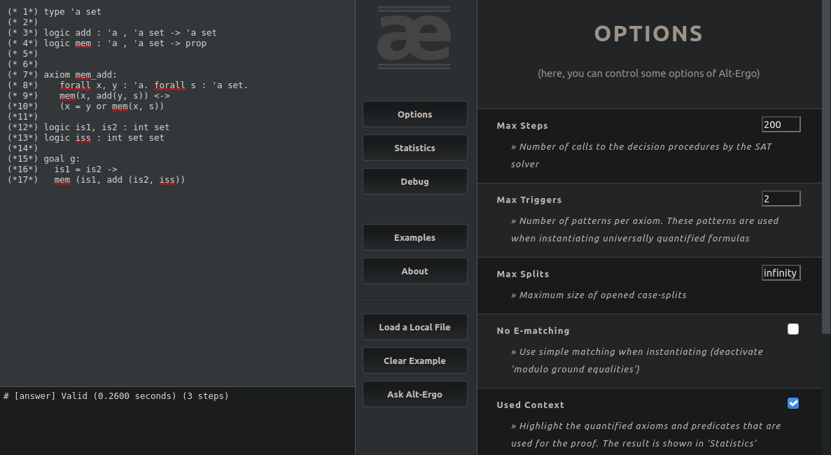StartandAboutthat contains general information about Alt-Ergo, Try-Alt-Ergo and how to use it.Outputsprints more information than the basic answer area under the editor. In these tabs you can find debugs (long) outputs, unsat-core or models (counter-example) generated by Alt-Ergo.Optionscontains every option you can use, such as the time limit / steps limit or to set the format of the input file to prove .Statisticsis still a basic tab that only output axioms used to prove the input problem.Examplescontains some basic examples showing the capabilities of our solver.